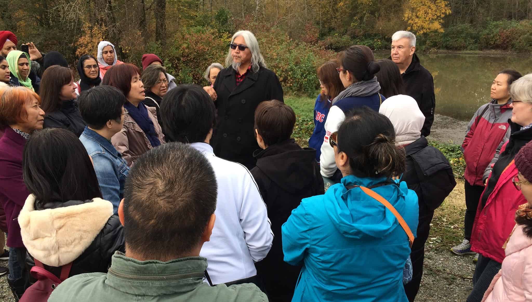 Sonny McHalsie, a Stó:lō historian speaking about the draining of Sumas Lake to a group of newcomers on a tour of Abbotsford history, services and attractions in 2019.
