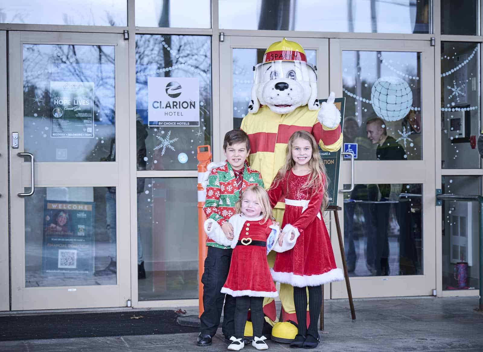Children posing with Sparky, the Abbotsford Firefighters mascot.