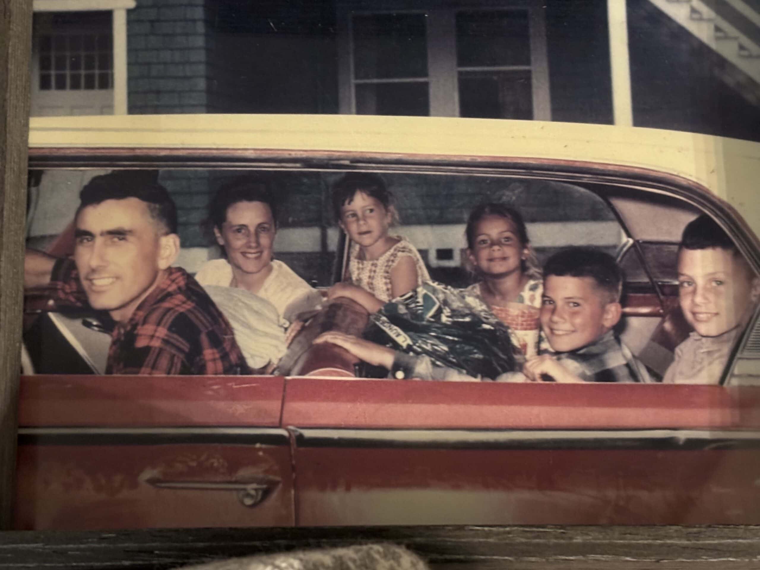 Dr. Elizabeth Watt (middle left) in 1962 with her father, mother and three siblings in Bella Coola just on their way to go on a family vacation. Old Bella Coola Hospital in the background.