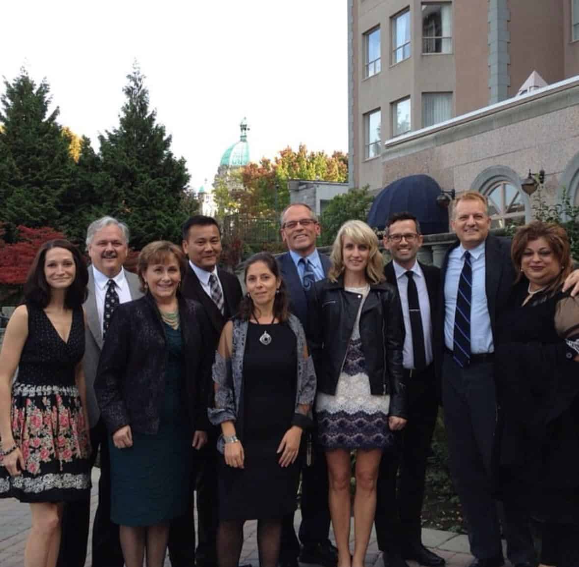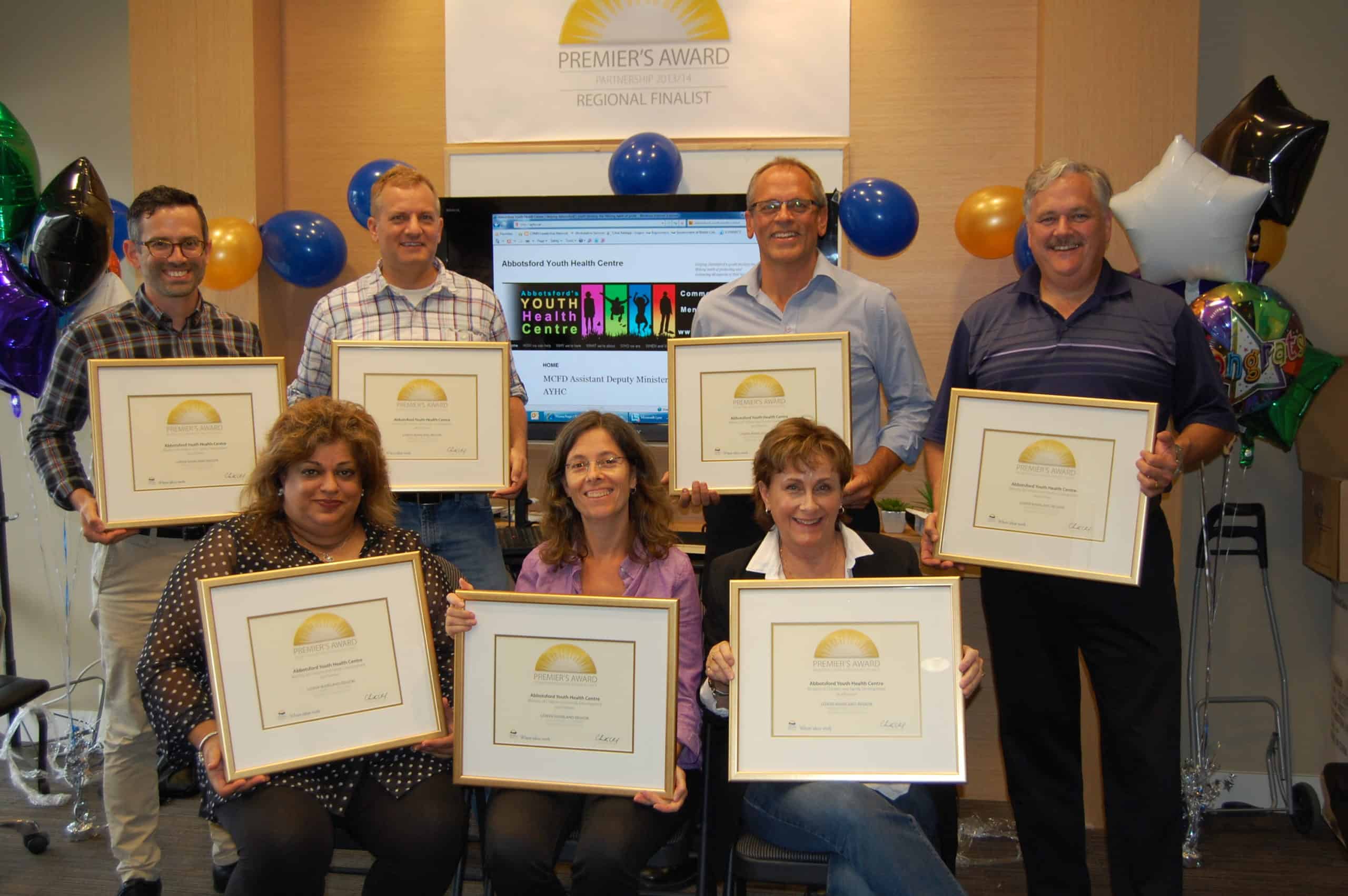 At the Victoria Premier’s Awards in 2014. From left to right: Krista Kenessey (AYHC), Mark Wardhall (MCFD-CYMH), Dr. Elizabeth Watt (AYHC), Holden Chu (MCFD), Simone Maassen (ACS), Eric VanEgmond (MCFD), Joanne Hamm (AYHC), Paul Enns (MCFD-CYMH), Brian Gross (IMPACT), Shairose Jinnah (ACS).